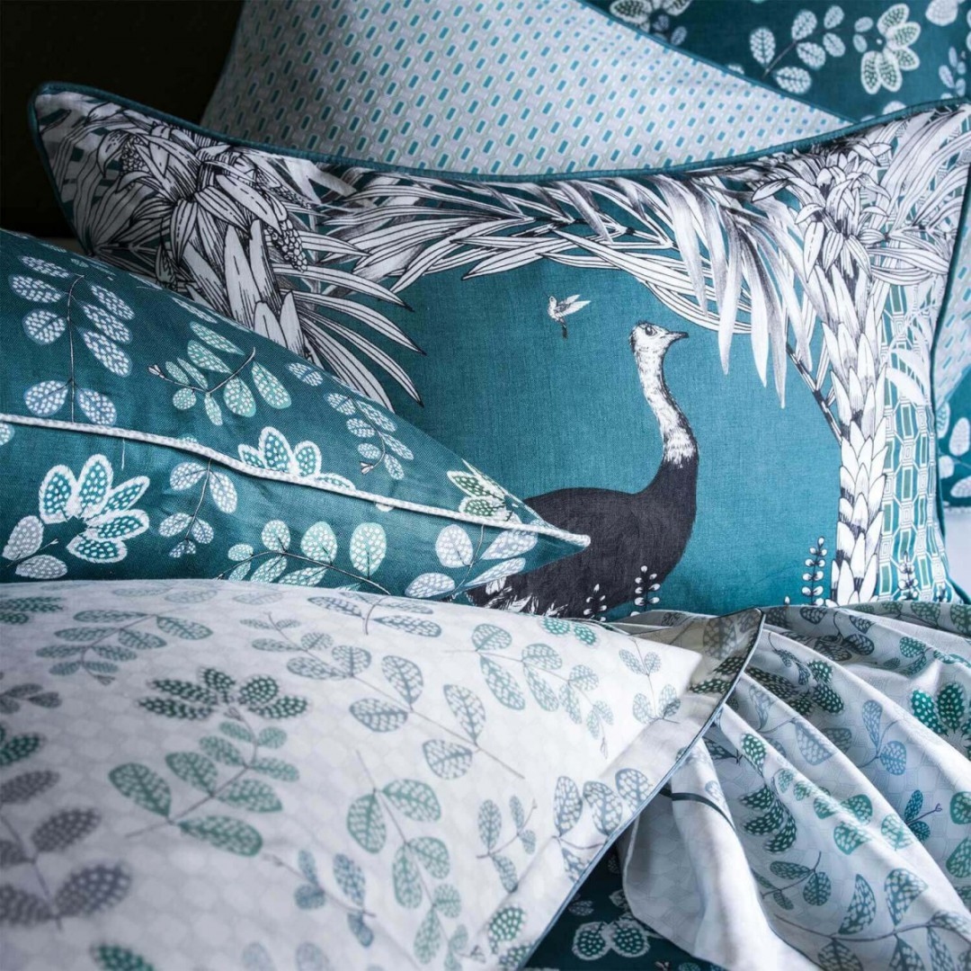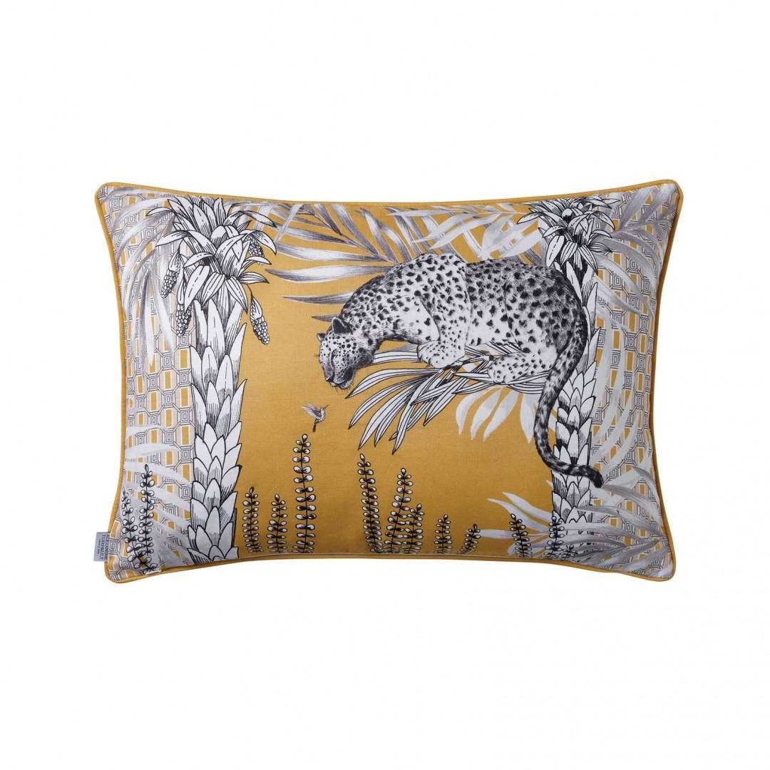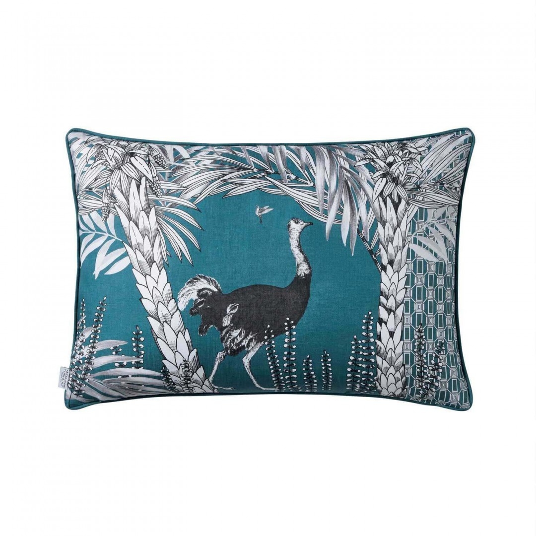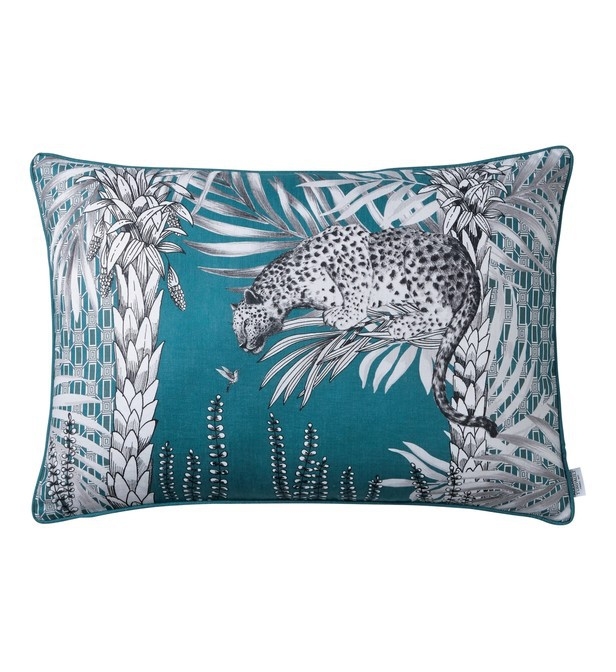Cushion cover in 100% printed linen, with two different patterns; on one side the panther and on the other the ostrich. A beautiful border around the contour. Zip closure invisible.