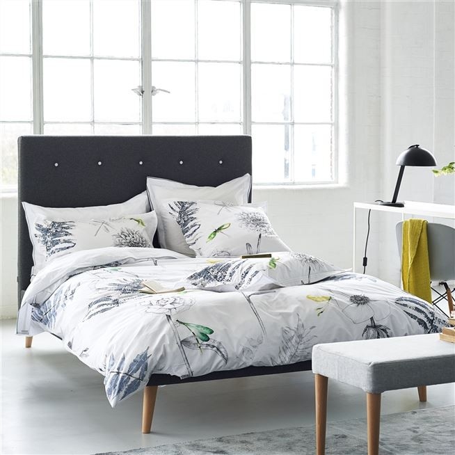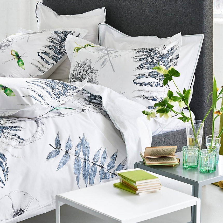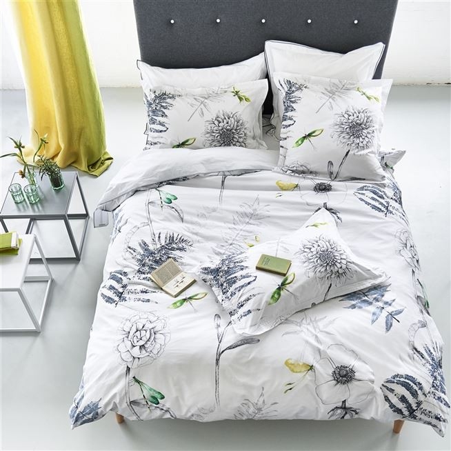 A smart, graphic floral bedlinen print with a highly detailed botanical studies of flowers and ferns, highlighted with soft washes of watercolour. Digitally printed onto crisp 200 thread count cotton with a pure white reverse. Finished with decorative stitch detailing on the pillowcases. Shown with Astor Graphite flat sheet and pillowcases.