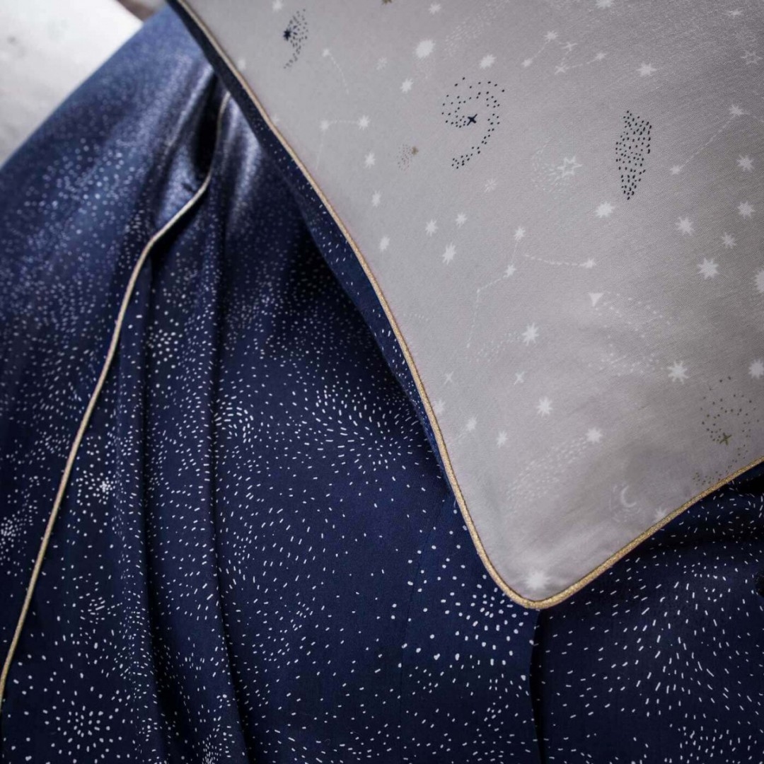 Fall under the spell of a night under the stars, in voluptuous satin adorned with a golden border.