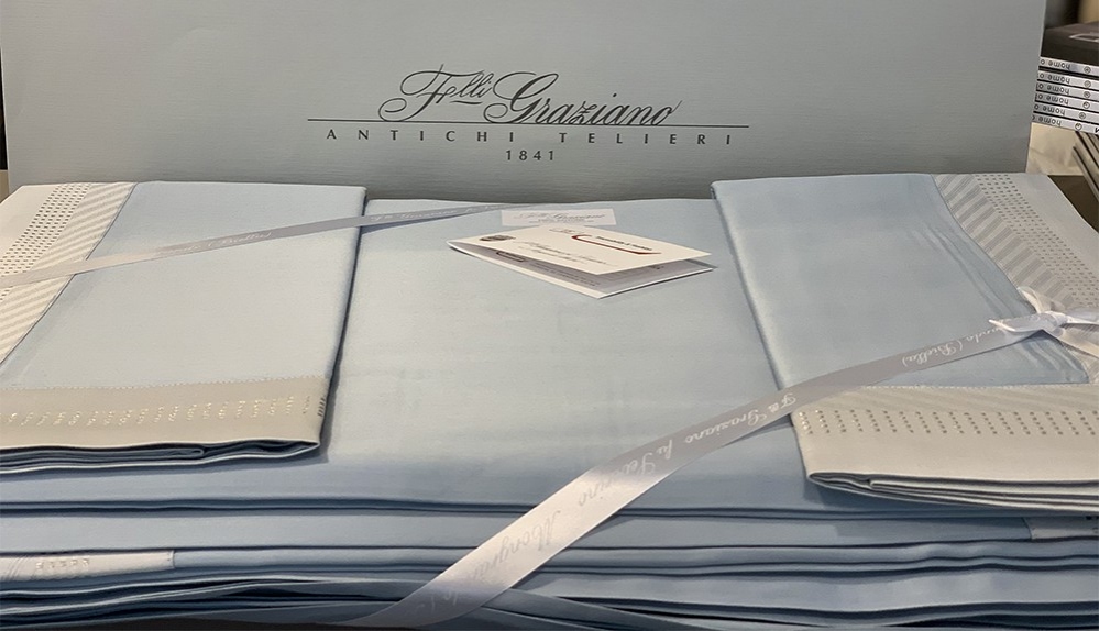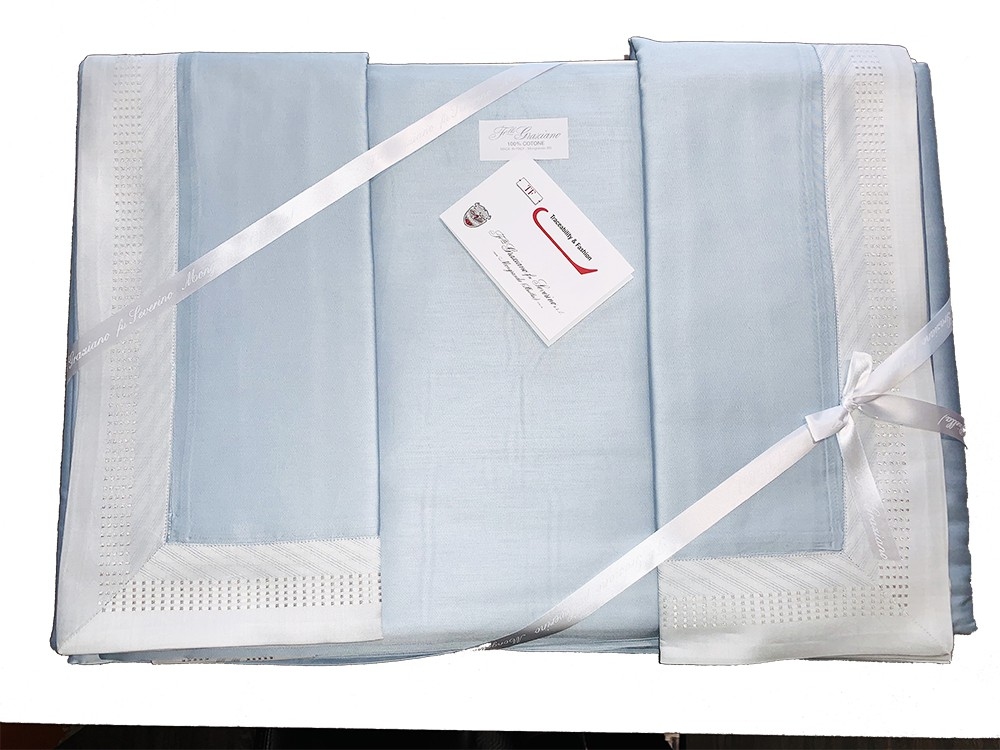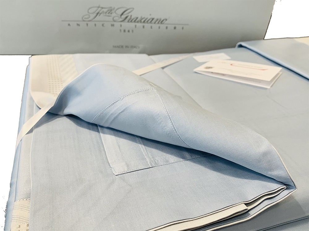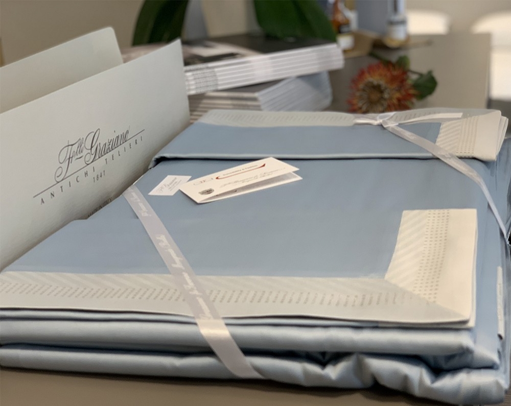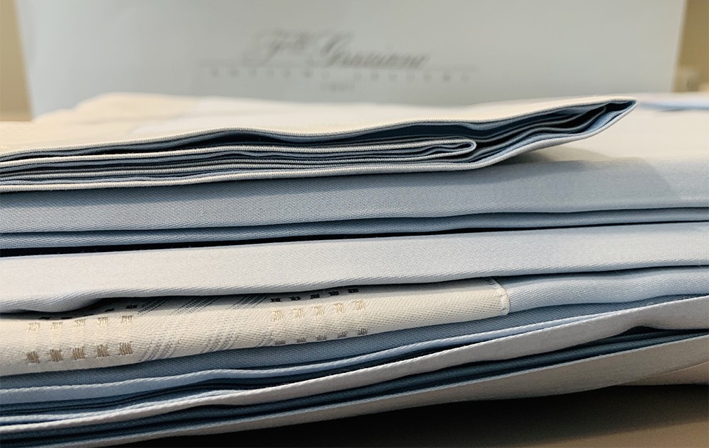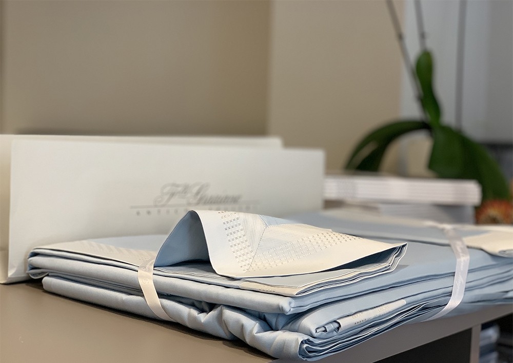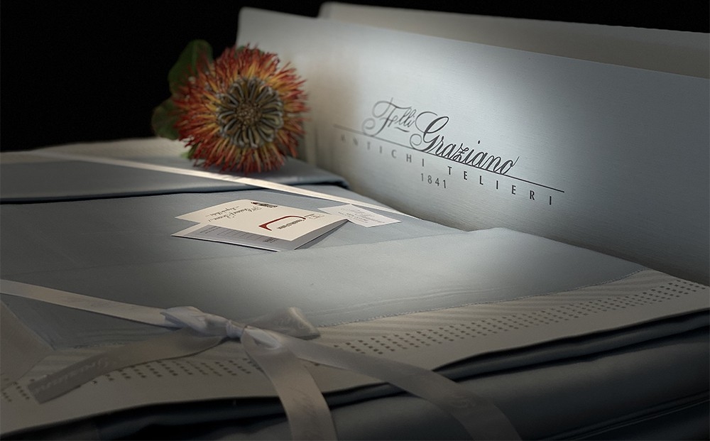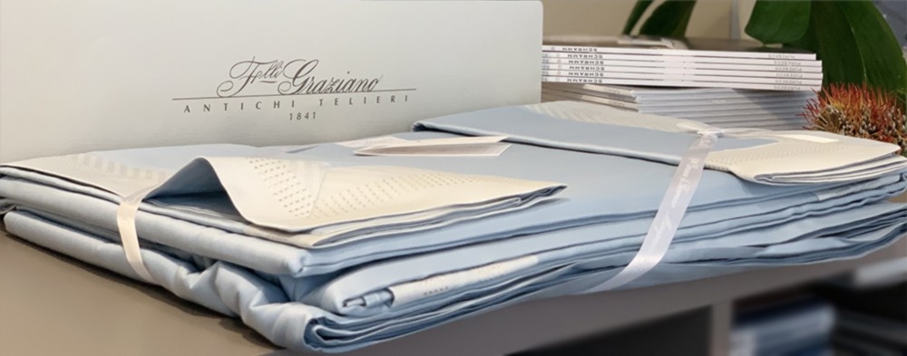 A new twist on solid-colored Jacquard fabrics. Time-honored methods are used to skillfully weave the borders that add an exquisite, three-dimensional aspect to the fabric. The latest fashion trend struts into the home. Lurex, a yarn with a metallic gleam, is woven to create delicately shimmery silver and white gold linens.